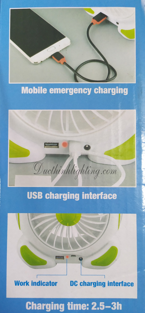- Quạt sạc kèm đèn led vừa có chức năng quạt mát, vừa có chức năng đèn thắp sáng và chức năng soi như đèn pin, Cánh quạt làm bằng nhựa mềm, bền đẹp, an toàn. Kích thước quạt nhỏ, gọn (10,6cm x 4,4cm x 14 cm), nên dễ dàng mang đi khi du lịch.