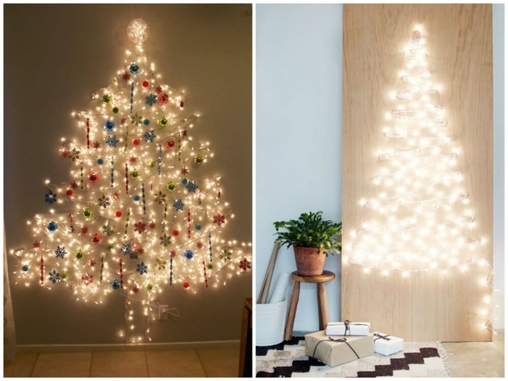 Nếu bạn quá bận và không thể tự chuẩn bị một cây thông noel cho dịp giáng sinh này thì dây đèn trang trí làm thành cây thông sẽ là lựa chọn hoàn toàn hợp lí. Bạn cần dây đèn trang trí giáng sinh có kích thước khá dài. Tạo hình cây thông Noel bằng cách đặt khung cây thông lên trên tường. Sau đó quấn dây đèn lấp kín thành hình cây thông phía trên.