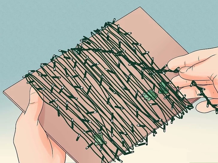 Bước 3: Cuộn đèn xung quanh tấm bìa. Bạn cần cuộn đèn sao cho gọn gàng, có thể là lần lượt từ đầu này tấm bìa sang đầu kia. Làm vậy sẽ giúp việc gỡ chúng ra vào sang năm dễ dàng hơn.