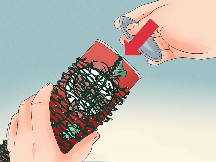 Bước 4: Cuộn dây đèn trang trí quanh ống. Bạn sẽ cuộn dây đèn từ miệng xuống dưới đáy ống và ngược lại; khi cuộn xong, cài đầu dây còn lại vào vết cắt trên miệng ống. Khi hoàn thành, dây đèn sẽ được cuộn xung quanh ống với hai đầu cài ở vết cắt trên miệng ống.