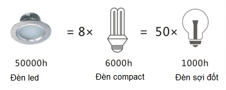 Đèn LED không bị cháy như đèn sợi đốt mà ánh sáng đèn LED chỉ có thể mờ đi theo thời gian mà thôi. Đèn LED có thể chiếu sáng được 30.000 – 50.000 giờ hay thậm chí lâu hơn nữa tùy thuộc vào chất lượng của đèn. Đèn sợi đốt chỉ chiếu sáng được khoảng 1.000 giờ còn đèn huỳnh quang compact thì chỉ 8.000 – 10.000 giờ mà thôi. Với tuổi thọ vô địch của đèn LED, các trung tâm thương mại, nhà hàng, khách sạn, khu chung cư, công xưởng sẽ không phải tốn chi phí nhân công để bảo trì hệ thống chiếu sáng.
