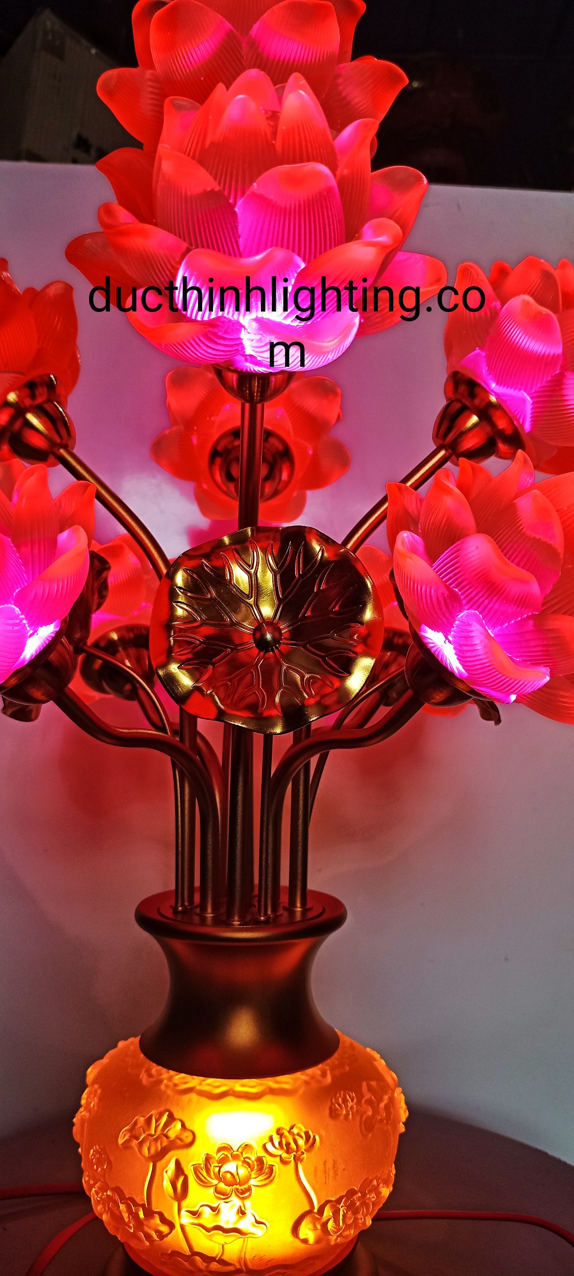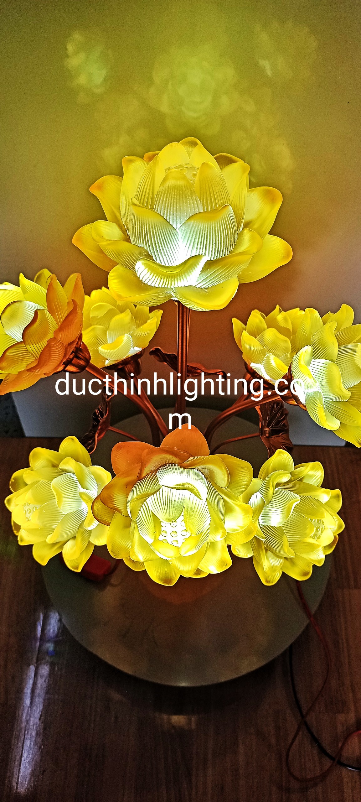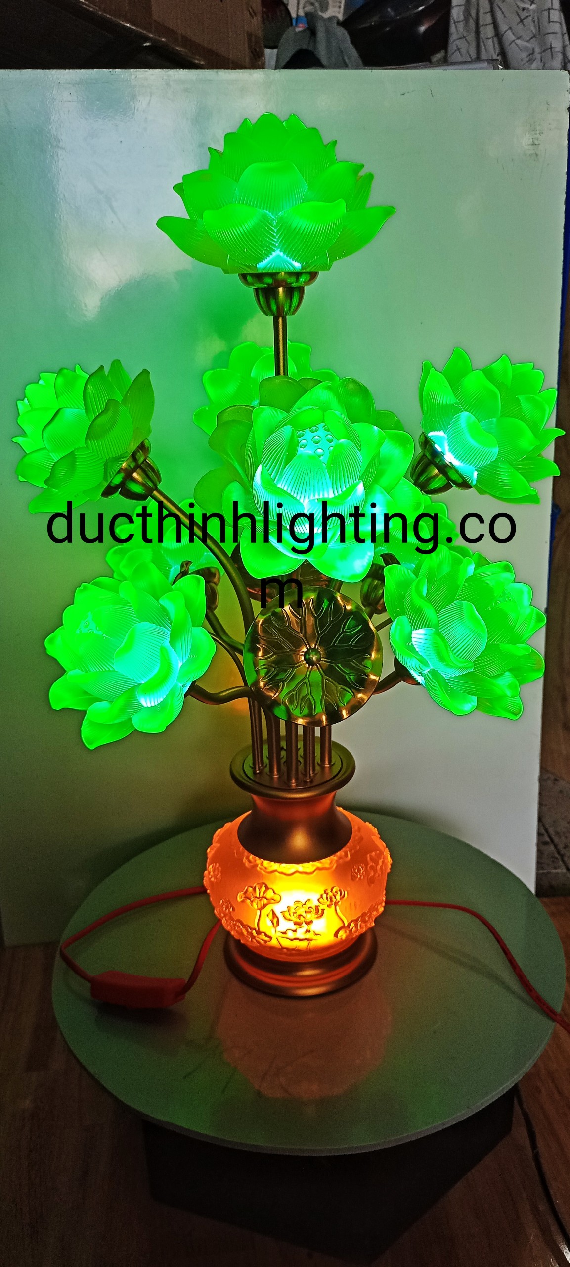 Đèn lưu ly 9 bông sen tự động đổi màu là sản phẩm trang trí độc đáo và đẹp mắt. Với chất liệu nhựa vàng ABS và hộp kim đồng thau, sản phẩm có độ bền cao và dễ dàng vệ sinh. Kích thước của đèn là 53cm x 35cm, phù hợp với nhiều không gian trang trí khác nhau.